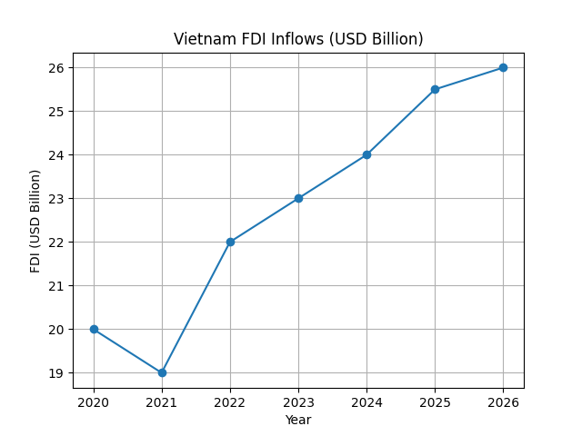 Foreign Direct Investment Inflows into Vietnam (2020–2026). Source: Author’s illustration based on KPMG (2025) and Vietnam Investment Review (2026).