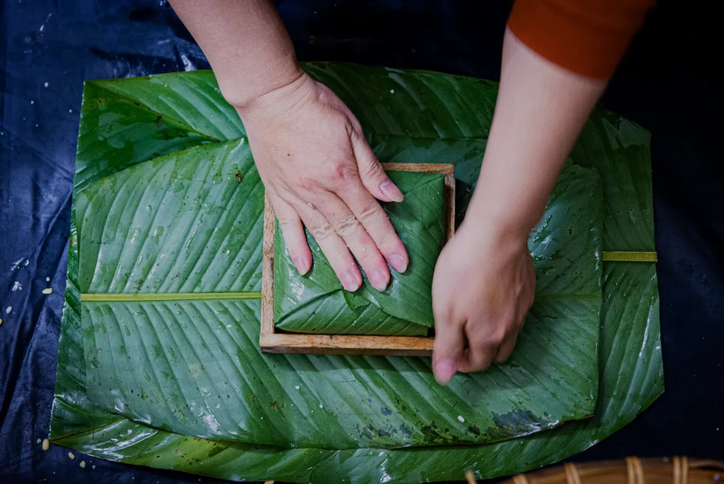 “Gói Bánh Chưng” (wrapping Bánh Chưng) is traditionally a collective activity. Grandparents, parents, and children gather together, sitting around low tables or mats, sorting rice, seasoning fillings, folding leaves, and tying the cakes with a string. Each person has a role: one washes the rice, another prepares the meat, while the elders often demonstrate the precise folding technique that keeps the square shape intact.