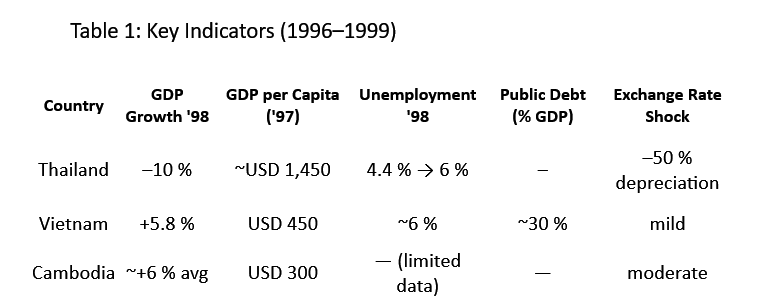 Over the past three decades, Southeast Asia has been subjected to a succession of profound economic shocks: the 1997 Asian Financial Crisis, the 2008 Global Financial Crisis, the COVID-19 pandemic, and, most recently, the ongoing trade and tariff tensions as of mid-2025. Vietnam, Cambodia, and Thailand, although geographically proximate and economically interconnected, have exhibited markedly distinct trajectories in terms of economic resilience, policy response, and long-term development.