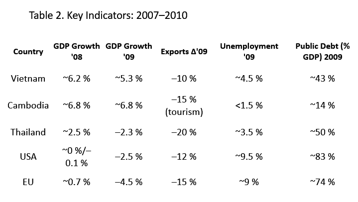 - Vietnam adopted fiscal and monetary stimulus, increasing public debt from ~32 % of GDP in 2007 to ~43 % in 2009.