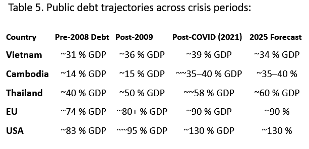 The Southeast Asian economies experienced more severe contractions but also faster rebounds, particularly in export-reliant sectors. Their debt-to-GDP ratios remained below those of advanced economies (EU ~90 %, USA ~130 %).