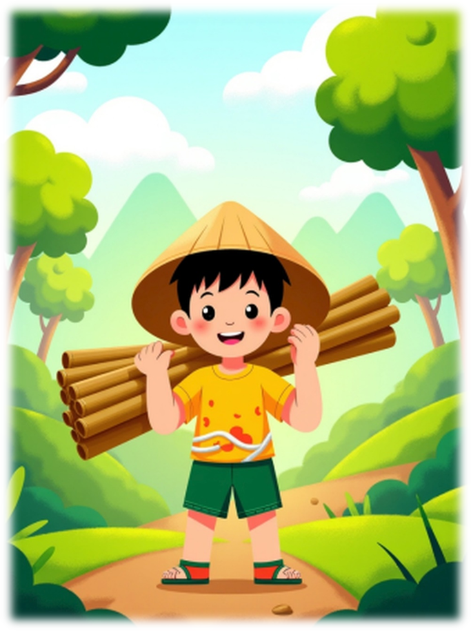 Khoai was overjoyed. He wanted to thank the old man, but the man had vanished. It was then that Khoai realised he had met Buddha. He set off to carry the bamboo back, but the stalk was too long to shoulder. It kept hitting trees as he walked. Frustrated, he sat down and wept once more. Immediately, the old man reappeared. Buddha asked, “Why are you crying?”